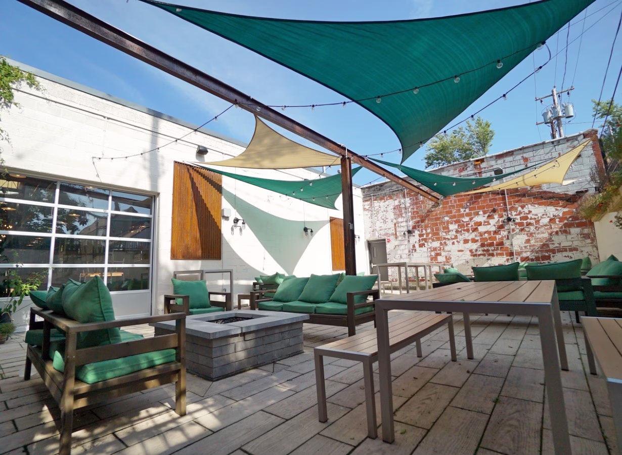 The production wing features a 2,305 SF brew area, a 1,082 SF cooler, and a 3,838 SF warehouse with a loading dock. The hospitality side includes a 1,913 SF taproom, a 490 SF kitchen with a 12-foot hood, and a 556 SF mezzanine for offices or private parties. The property is rich with character, featuring exposed brick, large windows, and an industrial feel, plus two outdoor dining areas including a front patio and a 1,181 SF courtyard beer garden.