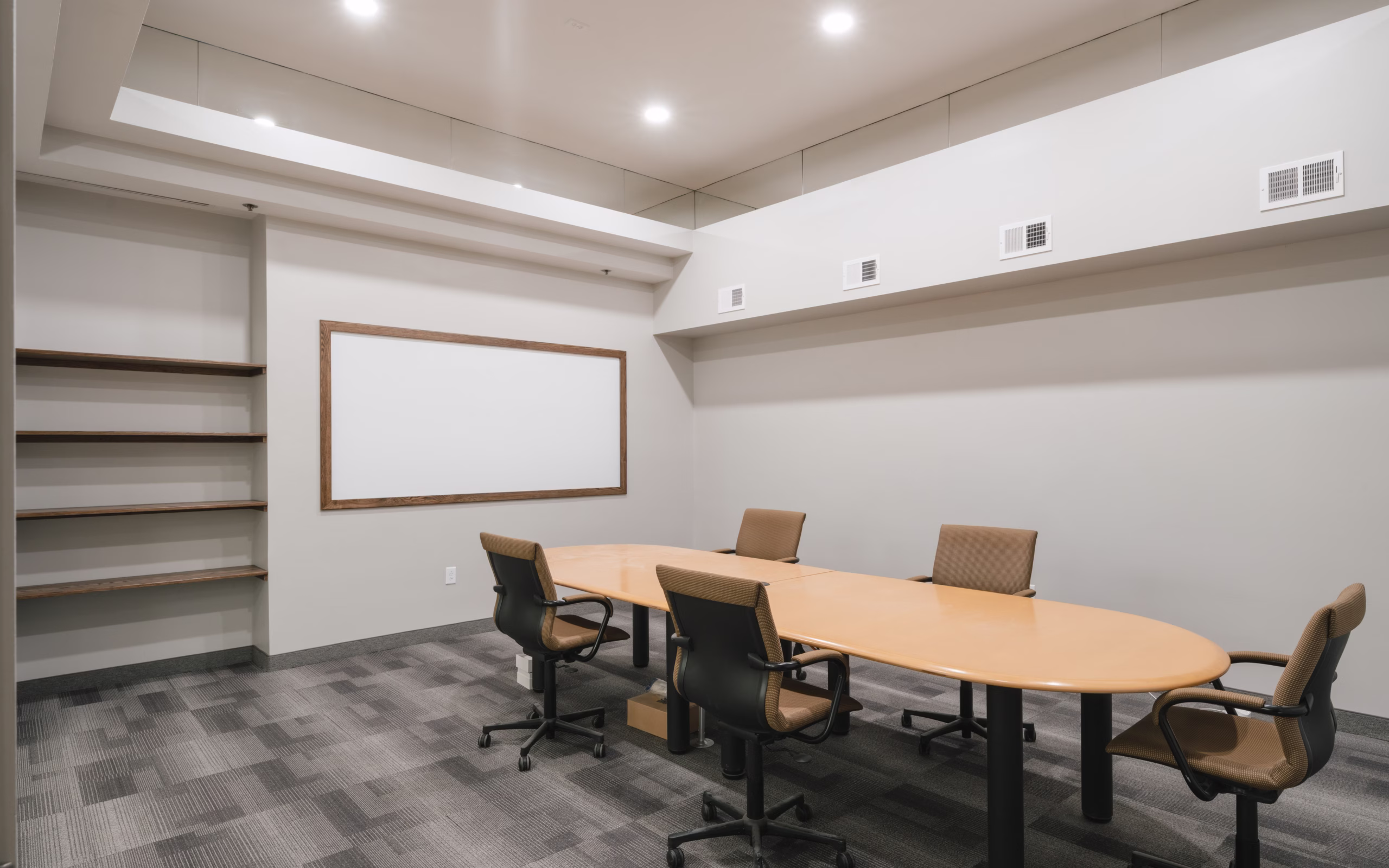 The efficient layout includes four private offices with views of Main Street, a large glass conference room for client meetings, and an open area for support staff. A versatile ancillary space can be configured as a fifth private office or a break room. A kitchenette is roughed-in for custom finish, and two bathrooms are included—one with a shower.