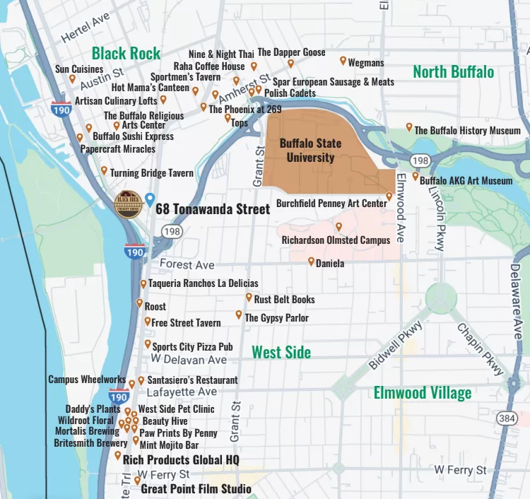 Located at the convergence of Buffalo’s West Side and Black Rock neighborhoods, the location benefits from ongoing investment activity, including the $35M Niagara Streetscape project. It offers excellent access to regional anchors like Buffalo State University, Rich Products Global HQ, and the new $50M Great Point Studios film production campus. The area is walkable and amenity-rich, anchored by two major grocers and vibrant corridors along Niagara and Amherst Streets featuring